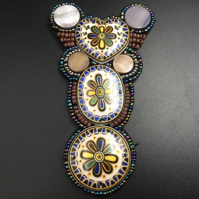 Украшение - оригинальное для женской одежды с использованием декоративных элементов ( бусин, стеклярус, пластик, ракушки, керамика). Ручная работа.